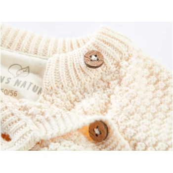 seitliche Holz-Knopfleiste erleichtert das Anziehen des Babyjäckchens. Der